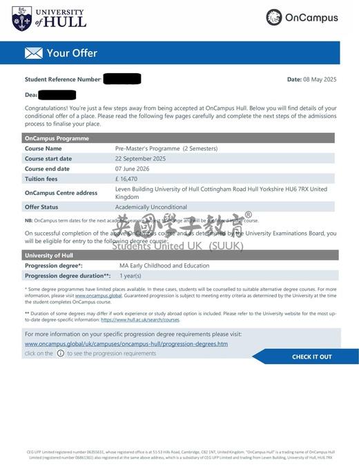 英国学子教育:英国赫尔大学硕士预科课程(2学期)+幼儿与教育硕士成功申请案例