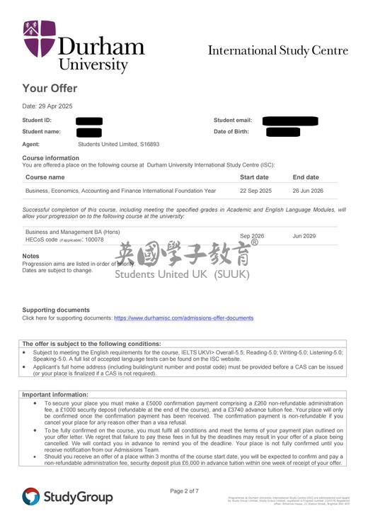 英国学子教育:英国杜伦大学商业、经济、会计与金融国际预科课程+商业与管理学士成功申请案例