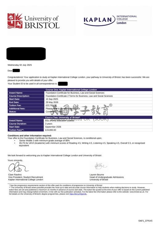 英国学子教育:英国布里斯托大学商业、法律与社会科学预科课程+教育学学士成功申请案例