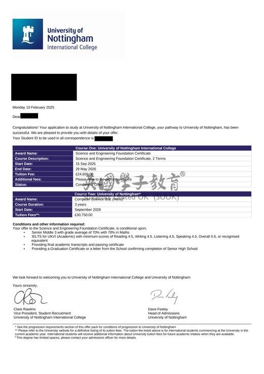 英国学子教育:英国诺丁汉大学科学与工程预科+计算机科学学士成功申请案例